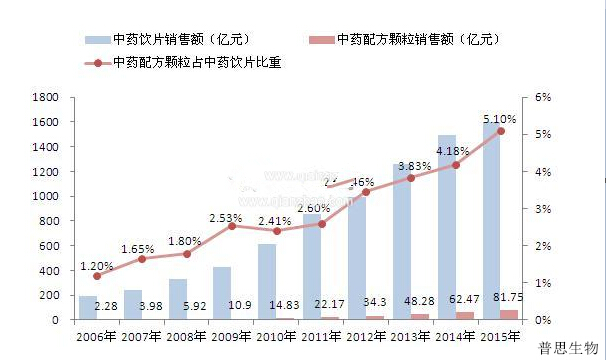 近年來中藥配方顆粒保持快速增長態(tài)勢,2006-2015年,中藥配方顆粒全國銷售額年均復合增速高達48.84%,遠高于同期中藥飲片26.7%的增長。