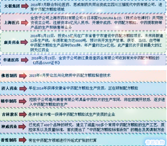 寬松的政策面讓眾多虎視眈眈的中藥企業(yè)燃起了雄心壯志,其實早在試點期間,便有多家藥企早早布好了局,期望能夠擴軍圈地,但受困于“試點未放開”,始終無法正式進入。隨著《中藥配方顆粒管理辦法(征求意見稿)》的下發(fā),康美藥業(yè)、上海醫(yī)藥、太極集團等耳熟能詳?shù)拇笮退幤蠹娂姳硎疽呀?jīng)或正在涉足中藥配方顆粒。