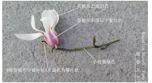 ▲望春玉蘭:花被片中部以下紫紅色,上部白色。9枚花被片中最外輪3片退化為萼片狀。(圖片來(lái)源:網(wǎng)絡(luò))