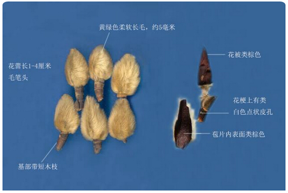 ▲望春花的干燥花蕾,呈倒圓錐狀,形如毛筆頭,黃綠色柔軟長(zhǎng)毛,基部帶有木質(zhì)短枝。(圖片來(lái)源于網(wǎng)絡(luò))