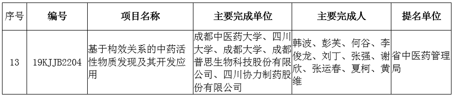 由四川省中醫(yī)藥局提名,我司作為主要完成單位之一申報的“基于構效關系的中藥活性物質發(fā)現(xiàn)及其開發(fā)應用”項目獲四川省科學技術進步獎(科技進步類)一等獎,公司董事長兼總經(jīng)理劉丁先生、原副總經(jīng)理夏柯先生是項目的主要完成人。項目的主要完成單位還有成都中醫(yī)藥大學、四川大學、成都大學和四川協(xié)力制藥股份有限公司。