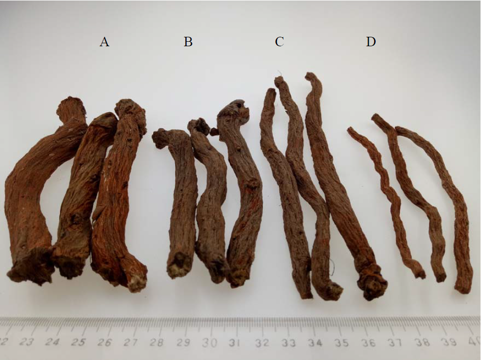 A——川丹參特級;B——川丹參一級C——川丹參二級;D——川丹參三級