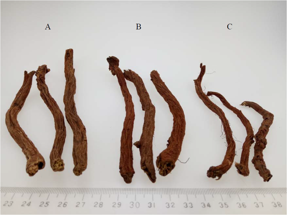 A——山東丹參一級;B——山東丹參二級;C——山東丹參統(tǒng)貨