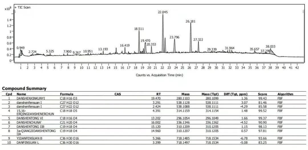 中藥材、浸膏/粉、復(fù)方制劑、發(fā)酵液等復(fù)雜樣品的化學(xué)成分分析。依托UPLC的高效分離能力和Q-TOF的快速鑒定能力,對各個特征峰進行分析。通過多維信息分析給予推測分子式,再通過譜庫鑒定給予推測結(jié)構(gòu)式。