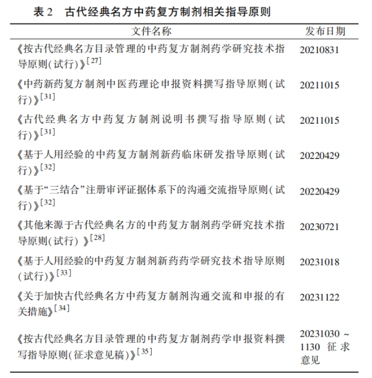 2019年12月以來新型冠狀病毒肺炎在全球蔓延,在這次抗擊疫情過程中,中醫(yī)藥通過臨床篩選出的有效方劑發(fā)揮了重要的作用??挂咂陂g,國家藥監(jiān)局采取早期介入、研審聯(lián)動等措施,邊審評、邊研究、邊總結(jié),探索優(yōu)化中藥注冊分類,批準(zhǔn)了多個古代經(jīng)典名方中藥復(fù)方制劑:2021 年 3 月 2 日,源自抗疫“三方”的清肺排毒顆粒、化濕敗毒顆粒、宣肺敗毒顆粒通過特別審批程序上市;2022 年10 月 9 日,散寒化濕顆粒上市。為促進(jìn)古代經(jīng)典名方制劑研發(fā),推進(jìn)疫情防控成果轉(zhuǎn)化,藥審中心將審評的經(jīng)驗進(jìn)行總結(jié),制定了古代經(jīng)典名方復(fù)方制劑的相關(guān)指導(dǎo)原則(表 2),加強(qiáng)技術(shù)標(biāo)準(zhǔn)體系建設(shè),全程加速相關(guān)品種的研發(fā)、申報和審評進(jìn)度。2022 年 12 月 28 日首個中藥3. 1類制劑苓桂術(shù)甘顆粒獲批上市,2023 年以來,枇杷清肺顆粒、濟(jì)川煎顆粒、一貫煎顆粒和芍藥苷草顆粒等多個中藥3. 1類品種獲批上市。