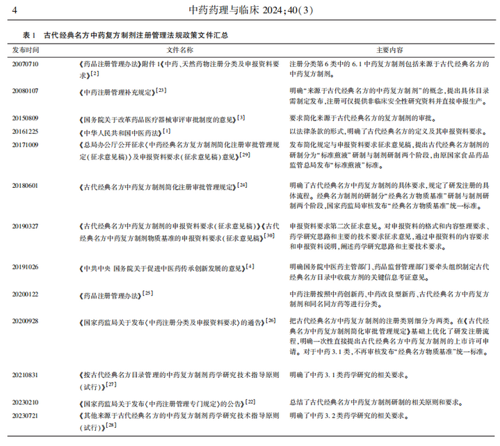 2015年《國務(wù)院關(guān)于改革藥品醫(yī)療器械審評審批制度的意見》明確要求“簡化來源于古代經(jīng)典名方的復(fù)方制劑的審批”。2016 年《中華人民共和國中醫(yī)藥法》(以下簡稱《中醫(yī)藥法》) 明確“古代經(jīng)典名方,是指至今仍廣泛應(yīng)用、療效確切、具有明顯特色與優(yōu)勢的古代中醫(yī)典籍所記載的方劑?!?“生產(chǎn)符合國家規(guī)定條件的來源于古代經(jīng)典名方的中藥復(fù)方制劑,在申請藥品批準(zhǔn)文號時,可以僅提供非臨床安全性研究資料。具體管理辦法由國務(wù)院藥品監(jiān)督管理部門會同中醫(yī)藥主管部門制定?!?這一立法規(guī)定大大加快了該類中藥復(fù)方制劑研究申報注冊的相關(guān)進(jìn)程,特別是相關(guān)注冊管理法規(guī)政策文件的出臺。見表1。2018年國家藥監(jiān)局發(fā)布了《古代經(jīng)典名方中藥復(fù)方制劑簡化注冊審批管理規(guī)定》,明確“經(jīng)典名方制劑的研制分‘經(jīng)典名方物質(zhì)基準(zhǔn)’研制與制劑研制兩個階段”,國家藥監(jiān)局發(fā)布統(tǒng)一“經(jīng)典名方物質(zhì)基準(zhǔn)”,可以分兩個階段提交申報資料。2020年新版《藥品注冊管理辦法》在中藥注冊分類中新增了古代經(jīng)典名方中藥復(fù)方制劑分類,并在隨后發(fā)布的《國家藥監(jiān)局關(guān)于發(fā)布〈中藥注冊分類及申報資料要求〉的通告》中將其細(xì)分為“按古代經(jīng)典名方目錄管理的中藥復(fù)方制劑” ( 以下簡稱中藥 3. 1 類)和“其他來源于古代經(jīng)典名方的中藥復(fù)方制劑” (以下簡稱中藥 3. 2 類)兩種情形,明確“注冊申請人一次性直接提出古代經(jīng)典名方中藥復(fù)方制劑的上市許可申請”,“不再審核發(fā)布‘經(jīng)典名方物質(zhì)基準(zhǔn)’統(tǒng)一標(biāo)準(zhǔn)”,從而進(jìn)一步簡化了該類制劑的注冊流程。2023年《中藥注冊管理專門規(guī)定》明確了古代經(jīng)典名方中藥復(fù)方制劑“不需要開展非臨床有效性研究和臨床試驗”,并明確了該類制劑注冊管理總體要求、審評模式等。國家藥監(jiān)局藥品審評中心(以下簡稱藥審中心) 分別于2021年和2023年發(fā)布了《按古代經(jīng)典名方目錄管理的中藥復(fù)方制劑藥學(xué)研究技術(shù)指導(dǎo)原則(試行)》和《其他來源于古代經(jīng)典名方的中藥復(fù)方制劑藥學(xué)研究技術(shù)指導(dǎo)原則(試行)》,明確了中藥 3. 1 類和中藥 3. 2 類的藥學(xué)研究要求。