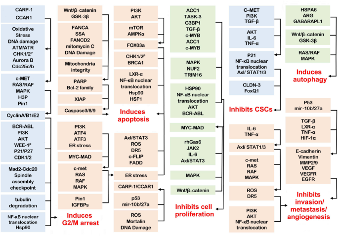 1.誘導(dǎo)細(xì)胞周期阻滯與凋亡:通過上調(diào)促凋亡蛋白(Bax、p53)和抑制抗凋亡蛋白(Bcl-2、Bcl-xL),激活線粒體途徑和Caspase級聯(lián)反應(yīng),導(dǎo)致癌細(xì)胞死亡;同時通過抑制CDK/cyclin復(fù)合物,阻滯細(xì)胞周期于G2/M期。[1]