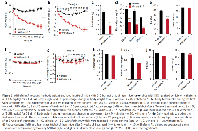 醉茄素A通過增強瘦素(leptin)敏感性顯著改善飲食誘導(dǎo)肥胖(DIO)小鼠的代謝異常(圖6)。此外,醉茄素A獨立于瘦素增敏作用,直接改善葡萄糖代謝。為開發(fā)新型抗肥胖藥物提供了新思路,具備臨床轉(zhuǎn)化潛力。[5]