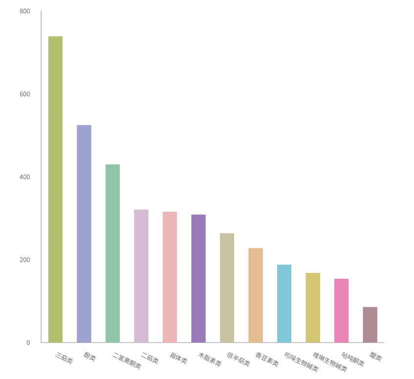 普思生物精準獲取了大量具有特色骨架結(jié)構(gòu)與顯著生物活性的小分子化合物,包含生物堿類、萜類、醌類、黃酮類、香豆素類、糖及糖苷類、苯乙醇類、酚類、酸類和醛類等主要結(jié)構(gòu)類型,下分近50種詳細類別。全面的結(jié)構(gòu)多樣性篩選覆蓋更多潛在的活性空間以提高藥物篩選命中率。