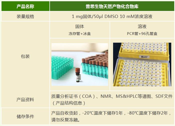 普思生物專注于天然產(chǎn)物研究與產(chǎn)業(yè)化應(yīng)用二十載,擁有許多積累了豐富分離純化經(jīng)驗的技術(shù)人員,具備強大的創(chuàng)新研發(fā)生產(chǎn)力。公司聚焦于天然藥物研究開發(fā)需求,旨在為中藥現(xiàn)代化研究及先導化合物的發(fā)現(xiàn)提供高質(zhì)量物質(zhì)基礎(chǔ)。現(xiàn)結(jié)合化合物結(jié)構(gòu)、來源、功能與應(yīng)用方向等推薦以下精選天然產(chǎn)物化合物庫: