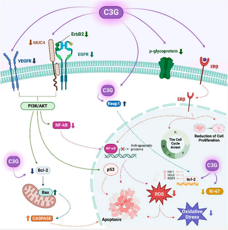 C3G對女性生殖健康有益,能保護(hù)卵巢細(xì)胞免受氧化應(yīng)激,抑制卵巢癌和宮頸癌細(xì)胞生長,并可能緩解多囊卵巢綜合征(PCOS)。