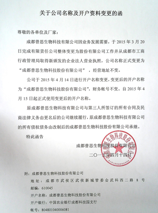 公司于2015年4月14日進(jìn)行開(kāi)戶(hù)名稱(chēng)變更,變更后的開(kāi)戶(hù)名稱(chēng)為“成都普思生物科技股份有限公司”,財(cái)務(wù)賬號(hào)不變。自2015年4月15日起正式使用變更后的開(kāi)戶(hù)名稱(chēng)。