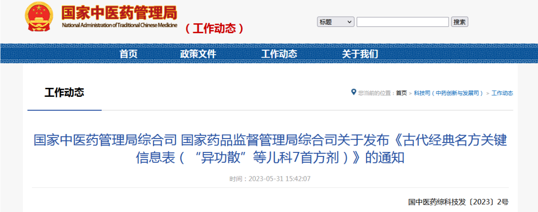 關(guān)于發(fā)布《古代經(jīng)典名方關(guān)鍵信息表(“異功散”等兒科7首方劑)》的通知