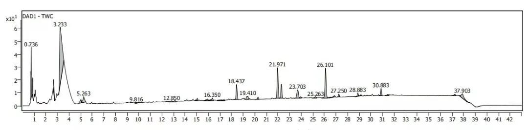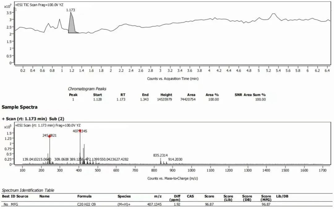 中藥材、浸膏/粉、復(fù)方制劑、發(fā)酵液等復(fù)雜樣品的化學(xué)成分分析。依托UPLC的高效分離能力和Q-TOF的快速鑒定能力,對各個特征峰進行分析。通過多維信息分析給予推測分子式,再通過譜庫鑒定給予推測結(jié)構(gòu)式。