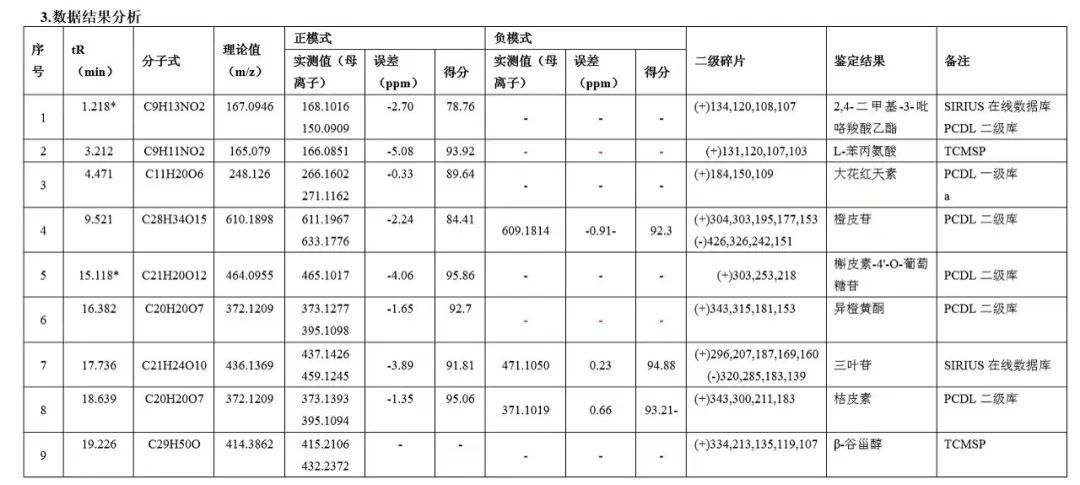通過精確質(zhì)量、同位素豐度比、同位素精確質(zhì)量比及MS/MS四維信息關(guān)聯(lián)分析給予推測分子量、分子式,部分化合物可通過譜庫鑒定給予結(jié)構(gòu)式。