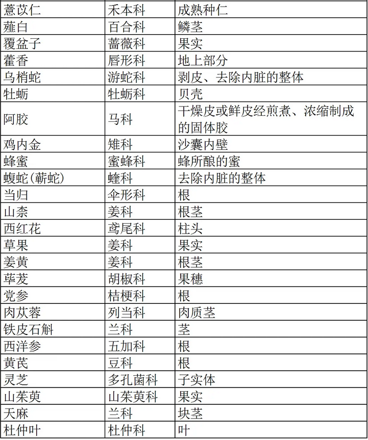 人參、人參葉、人參果、三七、土茯苓、大薊、女貞子、山茱萸、川牛膝、川貝母、川芎、馬鹿胎、馬鹿茸、馬鹿骨、丹參、五加皮、五味子、升麻、天門(mén)冬、天麻、太子參、巴戟天、木香、木賊、牛蒡子、牛蒡根、車(chē)前子、車(chē)前草、北沙參、平貝母、玄參、生地黃、生何首烏、白及、白術(shù)、白芍、白豆蔻、石決明、石斛、地骨皮、當(dāng)歸、竹茹、紅花、紅景天、西洋參、吳茱萸、懷牛膝、杜仲、杜仲葉、沙苑子、牡丹皮、蘆薈、蒼術(shù)、補(bǔ)骨脂、訶子、赤芍、遠(yuǎn)志、麥冬、龜甲、佩蘭、側(cè)柏葉、制大黃、制何首烏、刺五加、刺玫果、澤蘭、澤瀉、玫瑰花、玫瑰茄、知母、羅布麻、苦丁茶、金蕎麥、金纓子、青皮、厚樸花、姜黃、枳殼、枳實(shí)、柏子仁、珍珠、絞股藍(lán)、胡蘆巴、茜草、蓽茇、韭菜子、首烏藤、香附、骨碎補(bǔ)、黨參、桑白皮、桑枝、浙貝母、益母草、積雪草、淫羊藿、菟絲子、野菊花、銀杏葉、黃芪、湖北貝母、番瀉葉、蛤蚧、越橘、槐實(shí)、蒲黃、蒺藜、蜂膠、酸角、墨旱蓮、熟大黃、熟地黃、鱉甲