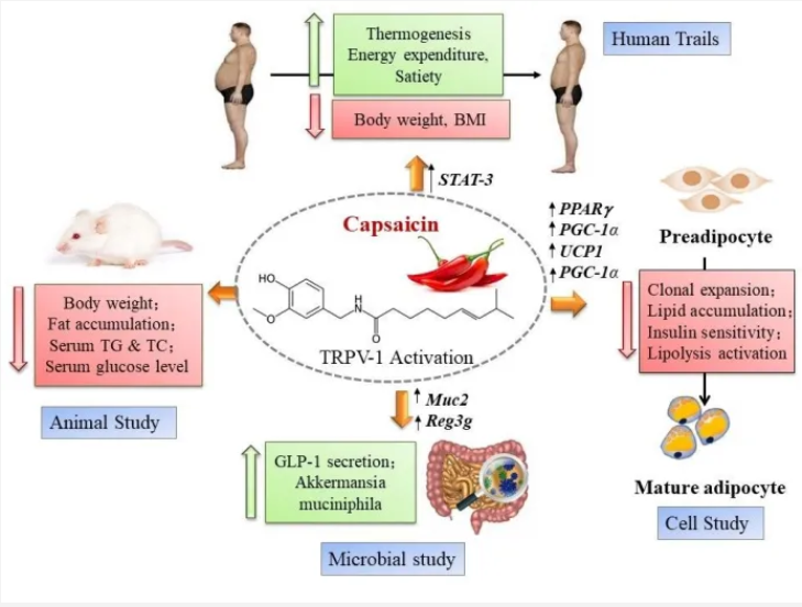 5. 抗肥胖作用:辣椒素已被證明可以抑制脂肪生成和促進(jìn)脂肪細(xì)胞中的脂質(zhì)氧化,通過(guò)作用于胃饑餓素調(diào)節(jié)下丘腦飽腹感和抑制食欲;通過(guò)上調(diào)UCP2和UCP3抑制體重增加;通過(guò)調(diào)節(jié)腸道菌群來(lái)增強(qiáng)產(chǎn)熱和維持代謝穩(wěn)態(tài)(圖二)。