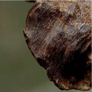 呈不規(guī)則塊、片狀或盔帽狀,有的為小碎塊。表面凹凸不平,有刀痕,偶有孔洞,可見黑褐色樹脂與黃白色木部相間的斑紋,孔洞及凹窩表面多呈朽木狀。質(zhì)較堅(jiān)實(shí),斷面刺狀。氣芳香,味苦。
