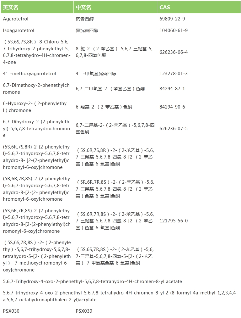 目前我司共有多種沉香色酮類活性成分,針對(duì)以下重點(diǎn)推薦的產(chǎn)品,普思生物均現(xiàn)貨供應(yīng),當(dāng)天發(fā)貨(價(jià)格面議)。