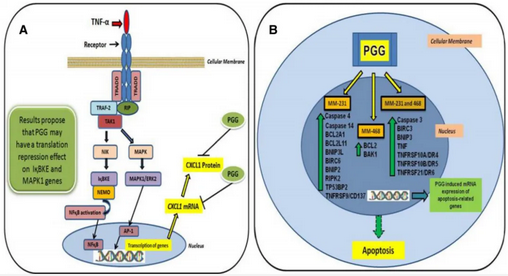 1、抗三陰性乳腺癌(triple-negative breast cancer,TNBC):Mendonca等的研究表明PGG具有抗癌能力,能夠通過(guò)增加TNF和TNF家族受體的表達(dá)來(lái)抑制腫瘤細(xì)胞增殖和GRO-α釋放,并誘導(dǎo)凋亡(圖一)。因此,建議將PGG作為TNBC的輔助療法,以提高化療效果并防止癌癥進(jìn)展。[2]