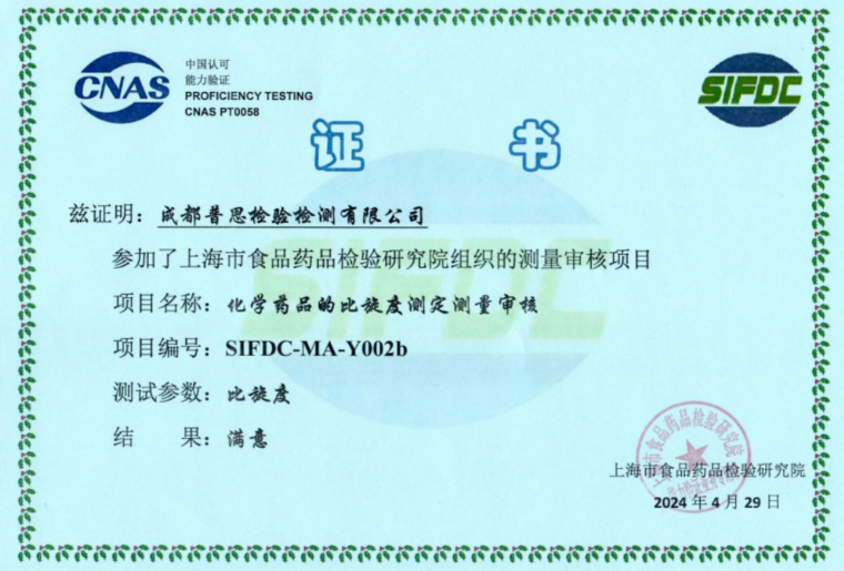 近日,成都普思生物科技股份有限公司旗下子公司“成都普思檢驗(yàn)檢測(cè)有限公司”通過(guò)了由上海市食品藥品檢驗(yàn)研究院于2024年組織的測(cè)量審核項(xiàng)目“化學(xué)藥品的比旋度測(cè)定”,結(jié)果為“滿(mǎn)意”。